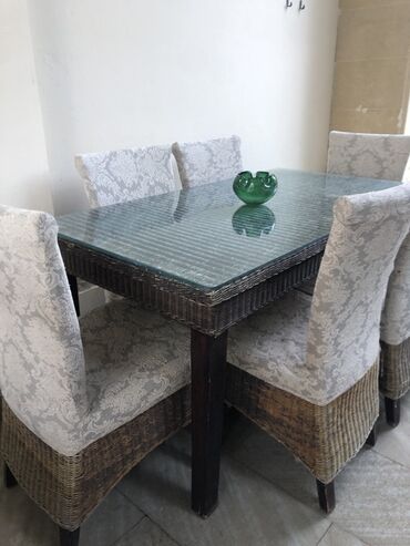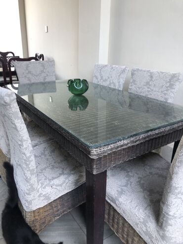 Rattan yemək dəsti – şüşə üstlü masa və 6 stul
