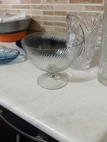 Dəstə daxil olanlar: 2 oval mavi şüşə servis boşqabı + 1 şəffaf ayaqlı desert qabı.