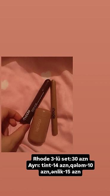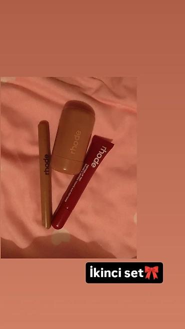 Rhode üçlü dəst: ənlik (peach),dodağ qələmi (choco),tint (cherry və ya ecspresso). Setin birgə qiymətidir,premium məhsullardır,qutuları və piqmentləri birə birdir