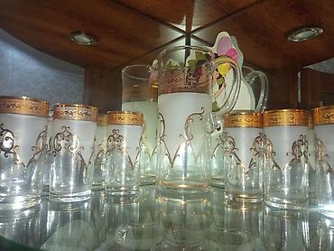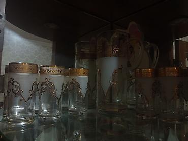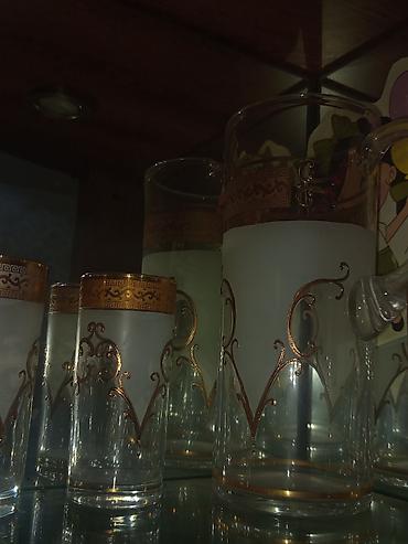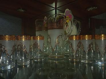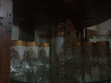 Şüşə sürahi və 6 stəkanlıq dəst - Material: qalın şüşə - Rəng və işləmə: buzlu şüşə fonu üzərində bürünc-qızılı tonlarda naxışlı kəmər; hər stəkanda və sürahidə rellefli ornament və dekorativ daş ...