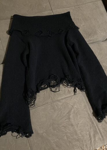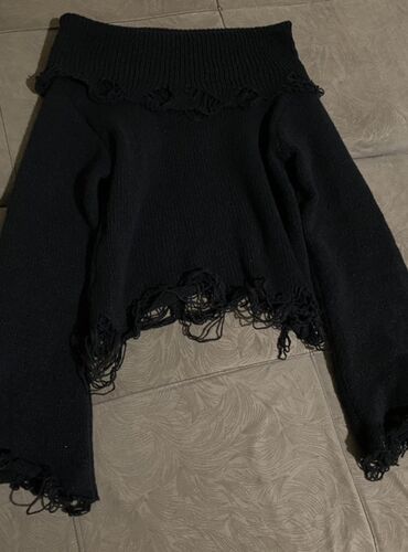 - Dizayn: aşağı hissədə və qolların uclarında qəsdən “distressed”/sökük effektli haşiyələr, elastik toxunmalı geniş bel-yaxa hissəsi