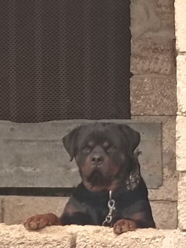 Rottweiler –Dişi 3 yaş, iri cüssəli, əzələli və güclü it - Rəng: qara, simmetrik qəhvəyi/tan işarələr (qaşlar, ağız ətrafı, döş və pəncələrdə) - Qısa və sıx tüklü örtük, parlaq yuxarı qat - Geniş b...