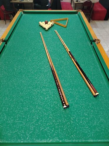 - Tam ölçülü rus biliardı masası: yaşıl feldspan örtük, möhkəm taxta korpus, klassik yuvarlaq ayaqlar, dəri lüzalar.