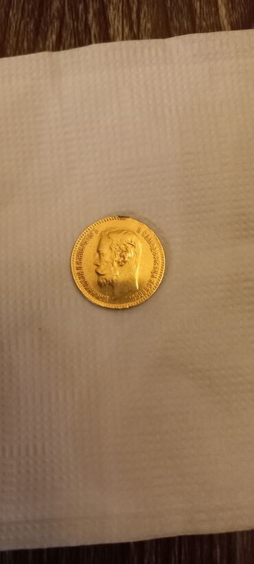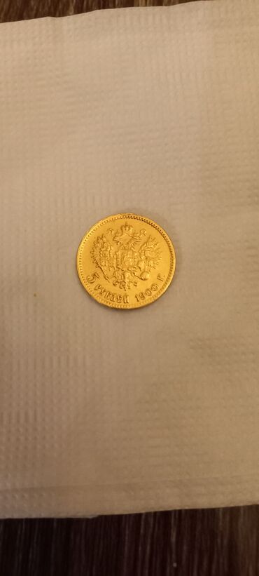 Məhsul: Nikolay II dövrünə aid qızıl pul – 5 rubl Say: 2 ədəd Xüsusiyyətlər: - Nominal: 5 rubl - İllər: 1899 və 1900 - Material: qızıl (orijinal imperiya sikkələri) - Ön üzü: Nikolay II-nin portre...