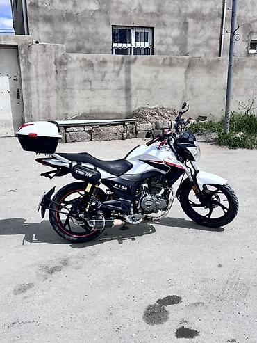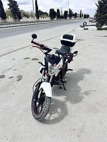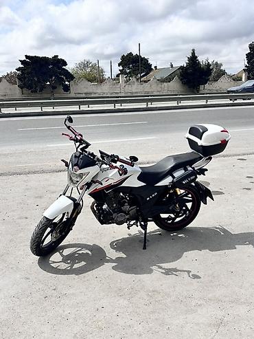 Sport üslubunda şəhər motosikleti və aksesuarlar - Korpus: ağ-qara rəng çalarları, kəskin idman dizaynı - Mühərrik: benzinli, hava soyutmalı (silsədə SS tipli egzoz/rezonator görünür) - Ötürmə: ay...