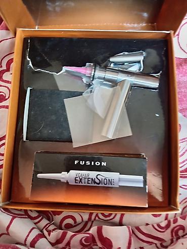 - Dəstdə görülənlər: aplikator aləti (uçluqla), qapaq/örtük hissələri, təlimat kartı və “Fusion” markalı kapsul yapışqan patronu (VidaHair Extension)