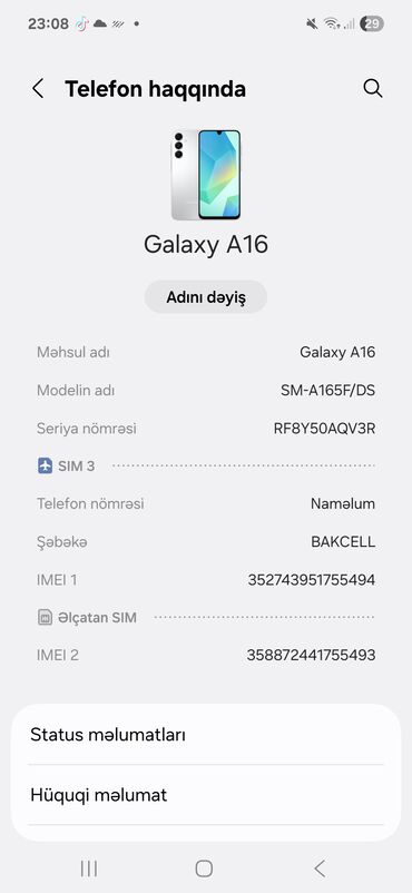 Samsung A16 ,Ram 6gb yaddaş 128gb,heç bir problemi yoxdur tək cızığı belə yoxdur.Fikri ciddi olmayan şəxslər narahat etməsin! Qerib