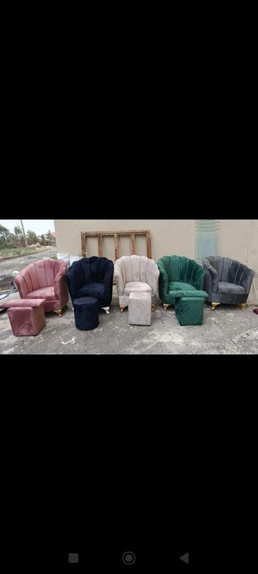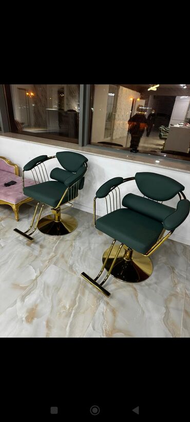 - Vizaj/Qonaq kresloları: Tünd yaşıl oturacaq və kürək yastıqları, qızılı rəng metal karkas. Döner baza, ön hissədə ayaq dayağı, erqonomik qol dayaqları. Estetik interyerlərlə uyğunlaşan modern dizayn.