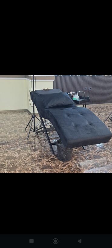 - Kosmetoloji/layner çarpayısı: Qara rəngdə, yumşaq süet tipli parça ilə örtülü, yastıqlı. Arxa hissə bucaq üzrə tənzimlənir, metal karkaslı dayanıqlı konstruksiya. Uzun seanslar üçün rahatlik təmin edir.