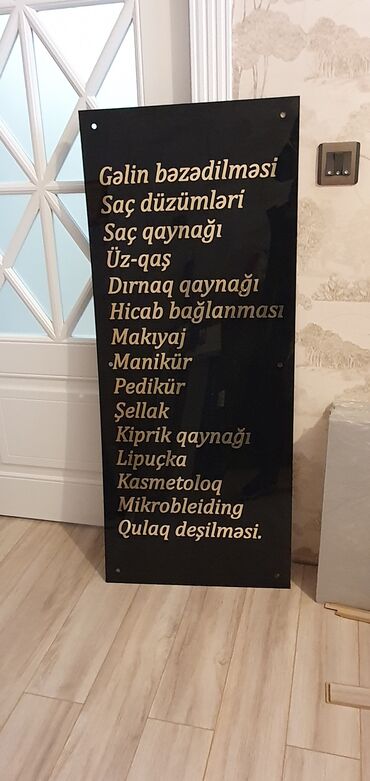 Hazır salon reklamı, istifadə olunmayıb. Qara orksteklo lövhə + qızılı orksteklo yazılar.