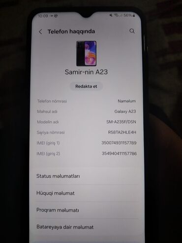 Qeyd: Şəkillərdə cihazın arxa çoxkameralı modulu, ön damcı‑noç ekranı və “Telefon haqqında” bölməsi görünür.
