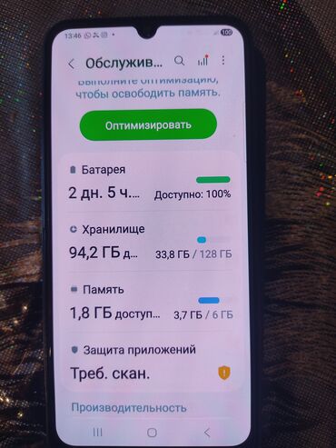 Qeyd: Cihazda hazırda 33.8 GB istifadə olunub, 94.2 GB boş yaddaş mövcuddur. Ekran görüntülərində cihaz optimizasiya və təhlükəsizlik bölmələri əks olunur.
