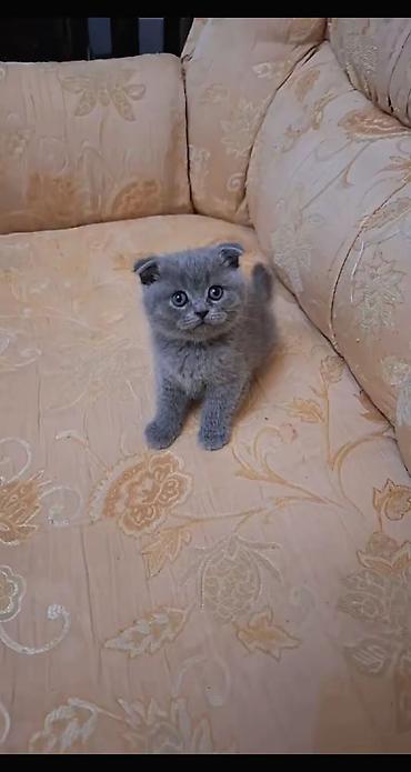 Skottiş pişik – gümüş rəngli, qısa tüklü - Cins: Scottish (şəkillərdə həm düzqulaq, həm də qatlanan qulaqlı fərdlər görünür) - Rəng: gümüş shaded/smoke, açıq krem-ağ altlıqla - Gözlər: parlaq sarı...