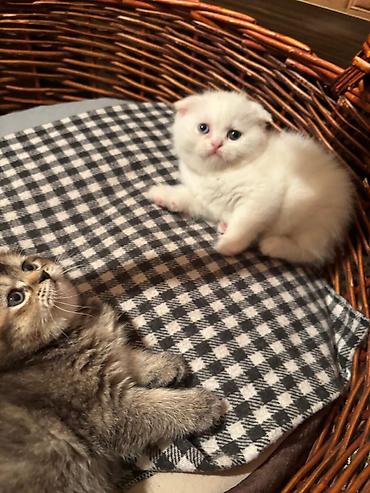 Britan tipli Scottish Fold balaları - Cins: Scottish Fold (qatlanmış qulaqlı) - Rənglər: krem-şabalıdı və ağ - Tük quruluşu: sıx və yumşaq, qısa tüklü - Gözlər: iri, ifadəli yuvarlaq gözlər - Xasi...