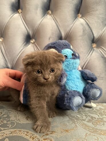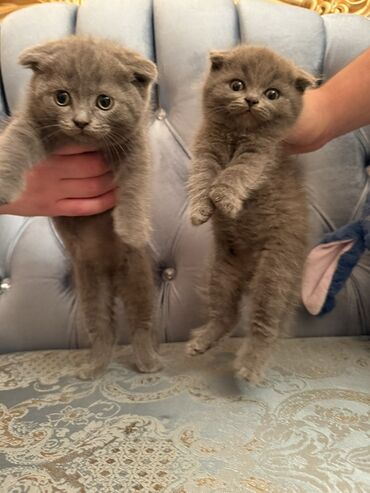 Skottiş Fold balaları – qıvrıq qulaqlı, iri yuvarlaq gözlü, yumşaq tüklü, sakit və mehriban xasiyyətli ev pişikləri. Xüsusiyyətlər: - Cins: Scottish Fold (qıvrıq qulaq) - Rənglər: gümüşi tabby, tü...