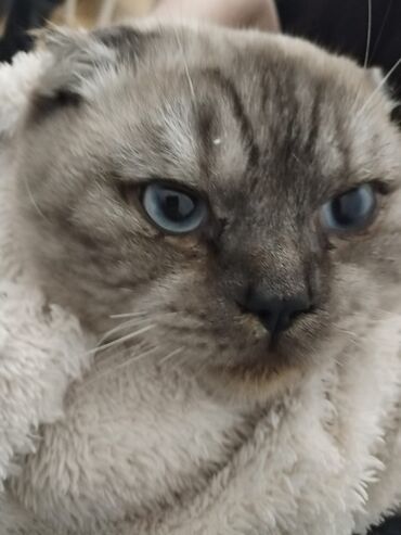 Scottish fold miks Xüsusiyyətlər: - Yaş: baladır (yeni doğulmuşdan bir qədər böyük) - Rəng: ağ-boz-qara qarışıq, pəncələri və sinəsi ağ - Qulaqlar yumuşaq aşağı əyimli, gözləri iri və mavi-boz t...