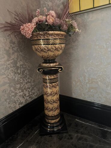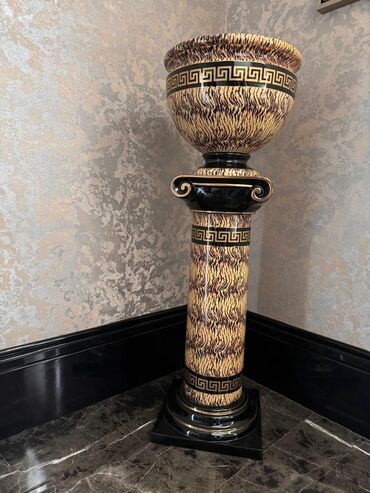 - Dizayn: Antik sütun formalı pedestal və üst hissədə iri kasavari vaz. Kənarlarında qızılı yunan frizi (meandr) naxışı, klassik ornamentli skroll detalları.