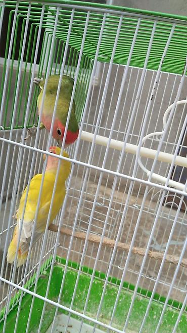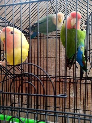 Satışda görünənlər: 1 cüt sevda papağanı + göstərilən aksesuarları olan metal qəfəs.