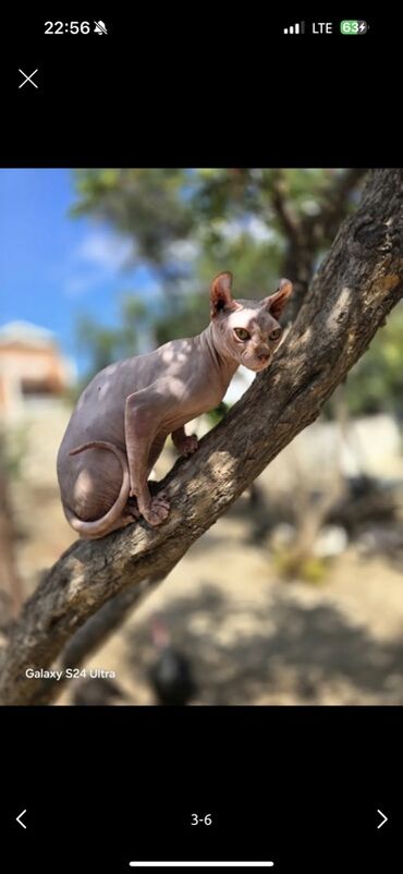 Sfenks pişiyi – tüksüz, qırışıqlı dəriyə və iri qulaqlara malik nadir cins. Şəkildə boyunluq/qoşqu ilə göstərilib, evdə və ya həyətdə nəzarətli gəzinti üçün uyğundur. Xüsusiyyətlər: - Tüksüz dəri...