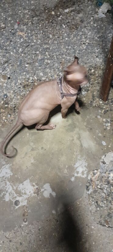 Sfenks pişiyi – tüksüz, qırışıqlı dəriyə və iri qulaqlara malik nadir cins. Şəkildə boyunluq/qoşqu ilə göstərilib, evdə və ya həyətdə nəzarətli gəzinti üçün uyğundur. Xüsusiyyətlər: - Tüksüz dəri...