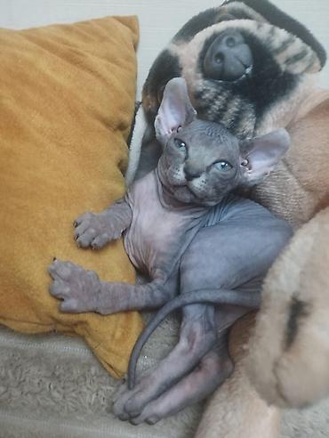 Kanada Sfenks pişik balaları - Cins: Kanada Sfenks (tüklüsüz) - Rəng: boz/mavi çalarlar, açıq mavi-yaşıl gözlər - Qulaqlar böyük, bədən quruluşu möhkəm, dəridə tipik qırışlar - Xasiyyət: mehriban,...
