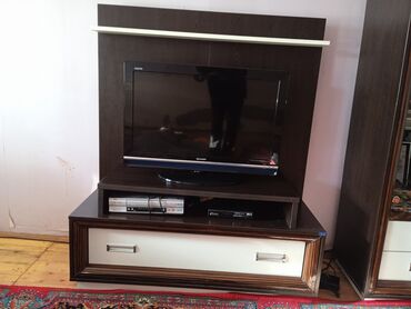 - Televizor: Sharp Aquos LCD (təxminən 32–37 düym ekran, paneldə ön hissədə “AQUOS” və “Sharp” loqosu görünür). Aşağıda masaüstü ayaqlıqla yerləşir.
