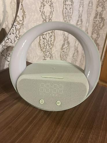 Çoxfunksiyalı masaüstü cihaz – Bluetooth kolonkası, saat-budilnik və simsiz şarj stansiyası - Dizayn: dairəvi futuristik korpus, masaüstü üçün dayaq ayaqları, ön paneldə LED ekran (saat/BT göstəri...