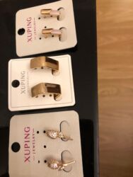 Zərgərlik dəsti – qizildi parıldayan qaşlı dizayn. Komplektə daxildir: - Uzun zəncirli boyunbağı: damla/yarpaq formalı iri asqı, xırda parlaq daşlarla bəzədilib. - Bilərzik: eyni motivdə oval-daml...