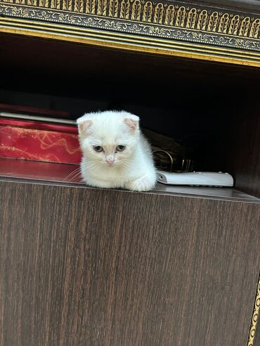 Məhsul: Şinşilla (qatlanan qulaqlı) pişik balası Xüsusiyyətlər: - Rəng: qar bəyaz, alında yüngül boz ləkələr - Qulaqlar: tam qatlanmış, tipik Scottish Fold görünüşü - Gözlər: iri və ifadəli - Tükl...