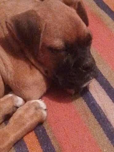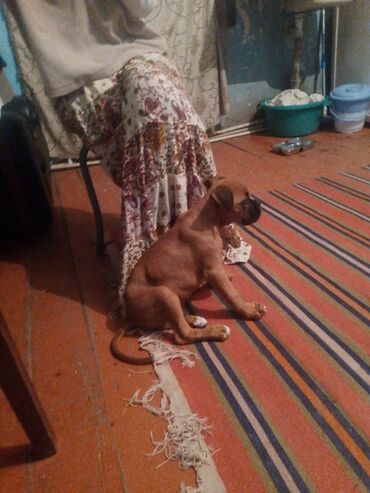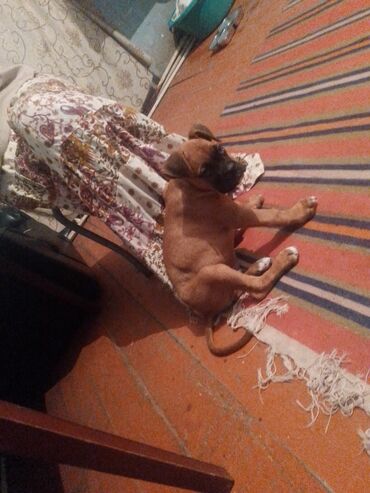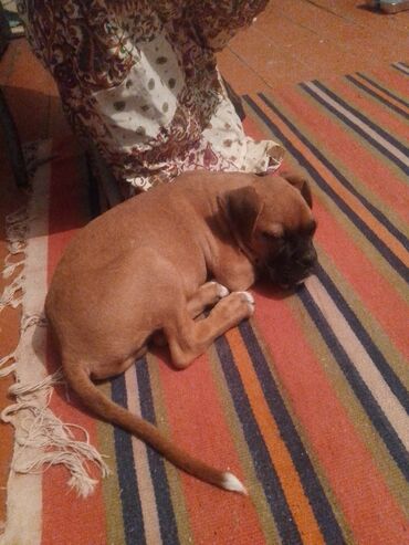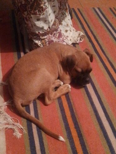 - Qəhvəyi rəngli, qısa tüklü, ağız və burun hissəsi tünd, pəncələrində və quyruğunun ucunda ağ ləkələri olan it balası.