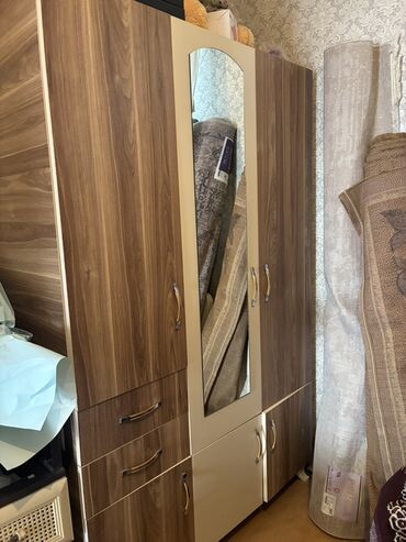 - Şkaf: 3 qapılı kombinə edilmiş model. Ortada böyük güzgülü qapı, yanlarda asılqan və rəf bölmələri. Aşağı hissədə əlavə saxlama üçün qapalı bölmələr və 2 ədəd siyirmə. Korpus ağac fakturalı laminat, ön panellər krem tonunda. Metall dəstəkli tutacaqlar. Geyim, məişət tekstili və aksessuarların səliqəli saxlanması üçün geniş tutum.