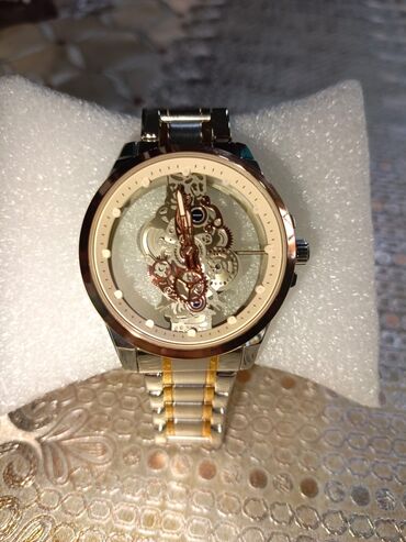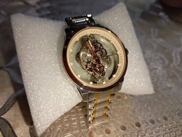 Qızılı skelet saat – metal qolbağlı, şaffaf siferblatlı - Korpus və qolbaq: parlaq qızılı rəngdə metal, zəncirvari halqalı bilərzik, qatlanan qarmaq bağlama - Siferblat: skelet dizayn – mexaniki h...