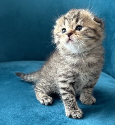 Skottiş Fold balası – qızılı rəngli, qısa tüklü - Cins: Scottish Fold (qulaqcıqları yığcam, önə doğru qatlanmış) - Rəng: qızılı/şabalıdı tonlarda, tünd zolaqlı quyruq və pəncə ucları - Gözlər: iri...