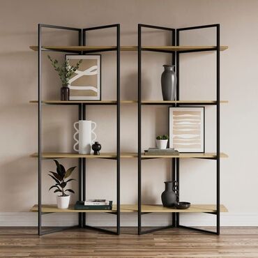 - Rəf sistemi: iki bölməli açıq konstruksiya, hər bölmədə çoxsəviyyəli rəflər. Kitab, bitki və dekor üçün geniş yerləşdirmə imkanı. Çərçivənin zigzaq/formalı dayaqları vizual dinamika yaradır və yükdaşımanı bərabər paylayır.