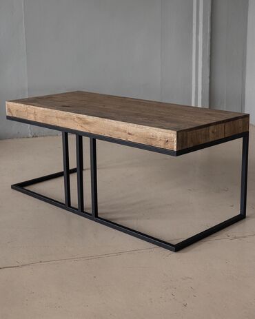 - Qəhvə masası: qalın üst səth (dərin ağac naxışı), asimmetrik U formalı metal baza, açıq konturlu dizayn sayəsində interyeri yüngülləşdirir. Stabil dayaq, kənarları qoruyucu çərçivə ilə tamamlanıb.