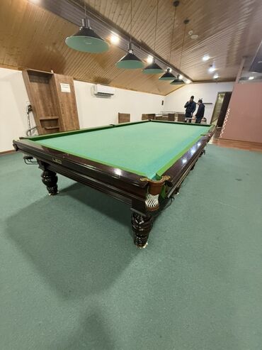 Bilyard masası – klassik dizayn, peşəkar ölçü - Növ: Rusiya bilyardı üçün peşəkar masa - Korpus: tünd qəhvəyi rəngdə massiv ağac, dekorativ oyma ayaqlar - Döşəmə: yaşıl rəngli keyfiyyətli keçə (cl...