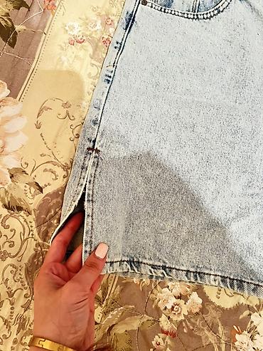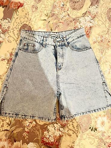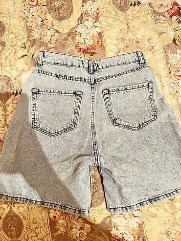 Mavi denim şort - Material: 100% kot (jeans), orta qalınlıq - Rəng: Klassik açıq-mavi “washed” effektli - Kəsim: Yüksək bel, rahat/relaxed fit, bir az geniş paça - Ön bağlanma: Metal düymə və möhk...