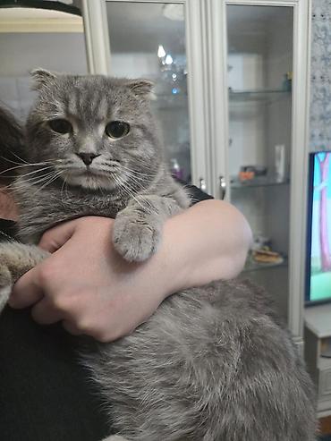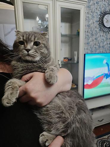 Şotland qıvraq qulaqlı pişik (Scottish Fold) – boz rəngli, qısa tüklü. Xüsusiyyətlər: - Cins: Scottish Fold (qıvrıq qulaqlar) - Rəng: bərk boz (solid grey) - Göz rəngi: parlaq sarı-qızılı - Tüklər...