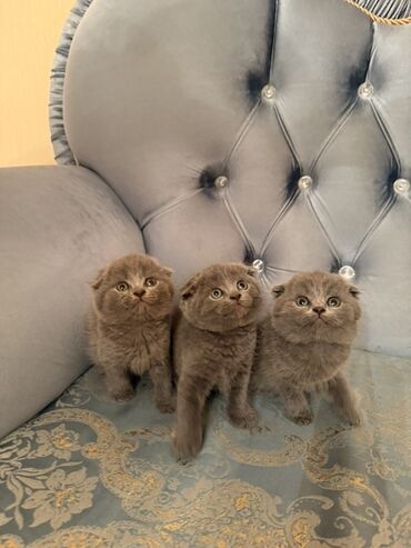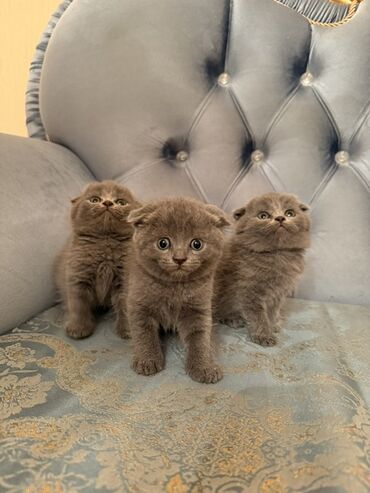 Balaca pişik balaları - Cins: Şotland qıvrımqulaq (Scottish Fold tipli görünüş – kiçik, yumulmuş qulaqlar, yumru baş və böyük gözlər) - Yaş qrupu: körpə pişiklər - Rənglər: - Tam boz (blue/boz t...