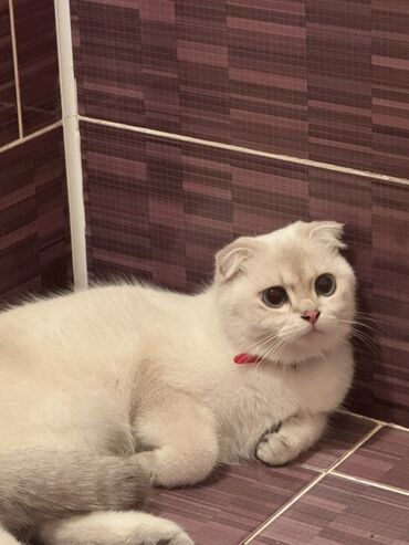 Ev pişiyi – qatlanan qulaqlı, krem-ağ rəngli - Cins xüsusiyyətləri: Qatlanan qulaqlar, kompakt bədən quruluşu, yumşaq qısa tüklü örtük. - Rəng və görünüş: Ağ-krem tonlarında kürk, alın hissəsində ...