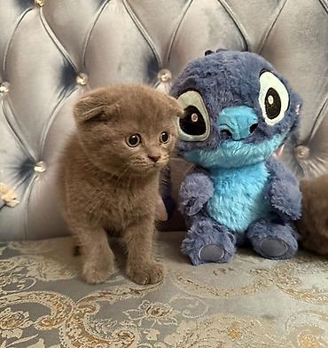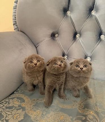 Skottiş Fold balaları – boz (blue) rəngdə, tüklü və yumşaq kürklü. Xüsusiyyətlər: - Cins: Scottish Fold - Qulaqlar: qatlanmış - Rəng: bərk boz/blue - Kürk: sıx və ipək kimi yumşaq - Gözlər: iri, i...
