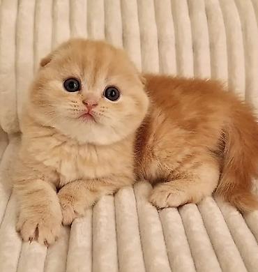 Scottish Fold pişik balası • Cins: Scottish Fold (qulaqcıqları qatlanmış) • Rəng: krem-bej bədən, qulaq və quyruqda daha tünd çalarlar; böyük dairəvi mavi-boz gözlər • Xüsusiyyətlər: yumşaq qısa t...