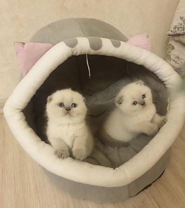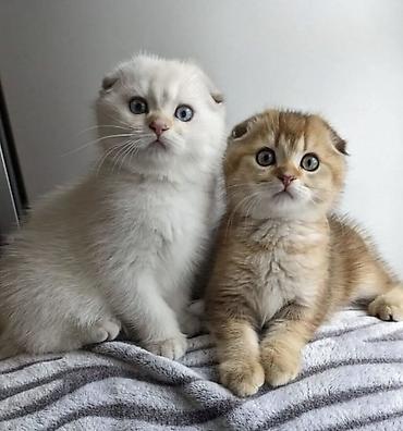 Skotish pişik balaları – ev şəraitində böyüdülmüş, sosial və mehriban. - Cins: Scottish (birində düzqulaq, birində fold qulaq quruluşu görünür) - Rənglər: gümüş-boz tabby və tünd qəhvəyi tabby nax...