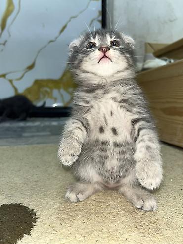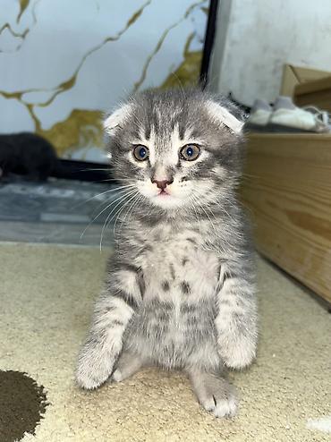 Skottiş qıvrıq qulaqlı balaca pişik balaları - Cins: Scottish Fold (qıvrıq qulaq) - Rəng: gümüş-boz tabby (zolaqlı), qarın hissəsi açıq krem - Göz rəngi: mavi (balalıq mərhələsi) - Yüksək sıxlıqlı...