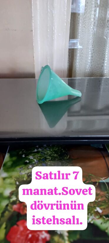 - Yaşıl plastik huni – mətbəx mayeləri və ya taxıl köçürmək üçün uyğundur. Qiymət: 7 manat (şəkildə göstərilib).