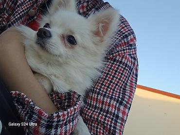 Ağ rəngli Pomeranian (Spitz) balası - Cins: Pomeranian (Zwerq Spitz) - Rəng: Təmiz ağ - Xüsusiyyətlər: Kompakt bədən quruluşu, sıx və yumşaq ikiqat tüklü örtük, qısa burun, kiçik dik qulaqlar, tün...