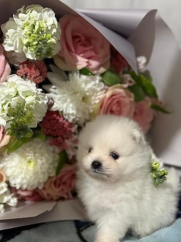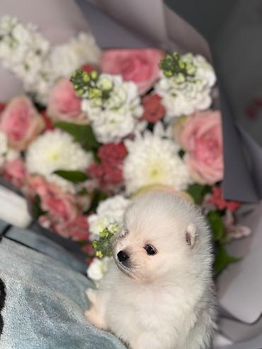 Pomeranian (Spitz) balaları – ağ tüklü, mini tip. - Xarakter: mehriban, oyunbaz, insanlara tez alışan, ev şəraitinə uyğun. - Görünüş: sıx və yumuşaq ikiqat ağ yun örtüyü, qısa burun, kiçik qulaql...