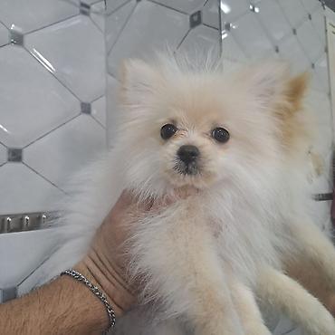 Cins: Pomeranian (Spitz) Rəng: Krem/ağ tonları Yaş qrupu: balalar Xüsusiyyətlər: - Kompakt bədən quruluşu, çox sıx və yumşaq ikiqat yunu - Qısa burun, kiçik qulaqlar, “oyuncaq” tipli ifadəli üz - A...