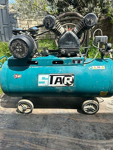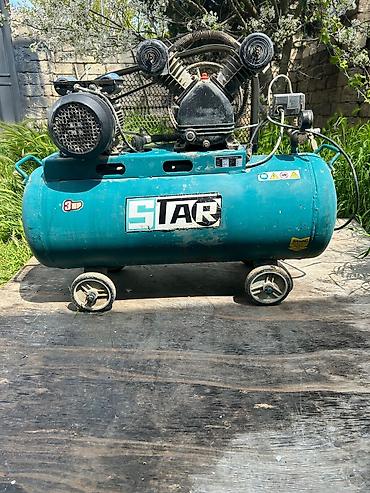 STAR markalı hava kompressoru - Güc: 3 HP (etiket üzərində göstərilib) - Tip: V‑şəkilli iki silindrli, kəmər ötürücülü pistonlu kompressor - Qab (rezervuar): üfüqi silindrik metal balon, dörd təkə...
