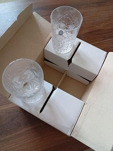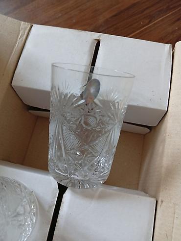 Kəsilmiş naxışlı şüşə stəkanlar və qızılı rəngli çəngəl–qaşıq dəsti - Şüşə stəkanlar: klassik kəsim ornamentləri ilə, qalın altlıq və yanlarda dekorativ geometrik–bitki motivləri. Qutuda yerləşdir...